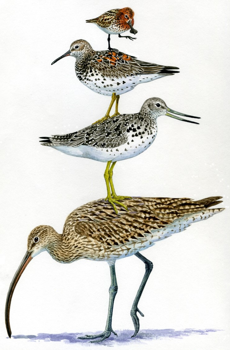 每年7月底8月初,勺嘴鹬先遣部队就会达到条子泥,10月底再往南迁徙。两个多月时间里,勺嘴鹬会在条子泥这片“露天食堂”觅食,为越冬积累脂肪。观察照片能看出来,勺嘴鹬的腹部轮廓会随着时间会变圆。这段时间,他们还会换下鲜艳的繁殖羽,换上越冬羽,从“红勺子”变身“白勺子”。“勺嘴鹬个小,每隔几百公里就要停下歇息,完成一趟越冬飞行体重少一半,在栖息地进行能量积累非常重要。”