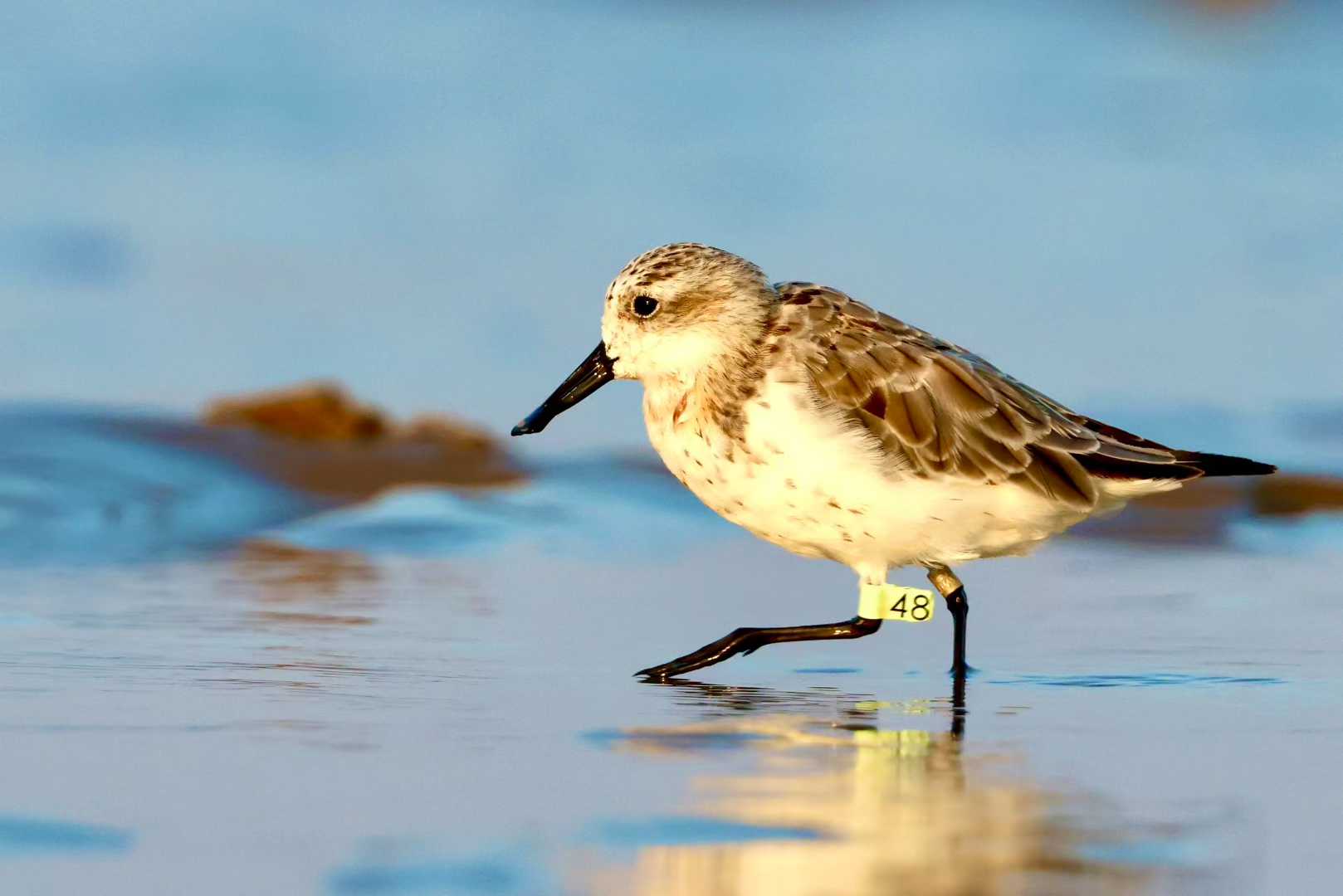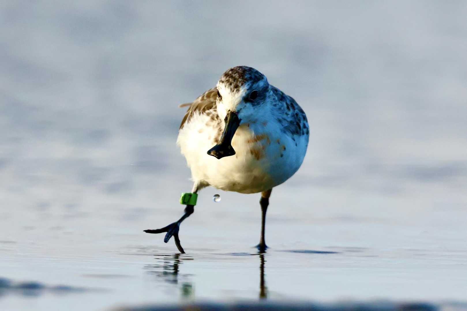 7月29日,李东明第一次记录到今年在条子泥秋迁歇脚的勺嘴鹬。截至9月底,镜头已经捕捉到上百只“小勺子”,光是旗标就看到20多次。“99、97、8M这些老朋友都回来,每年看到它们就像看到外面的小孩回家一样开心。”